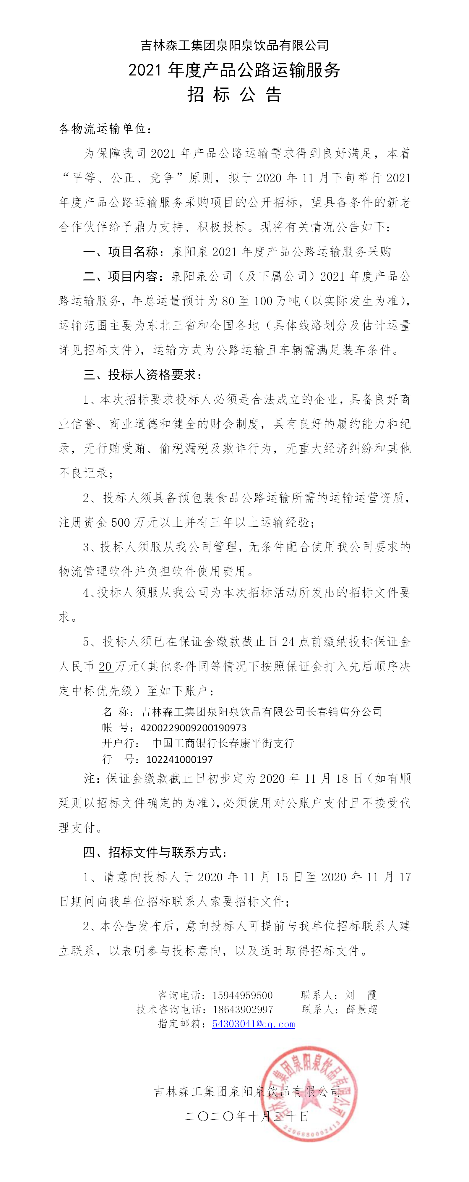 2021年度產(chǎn)品公路運輸服務招標公告